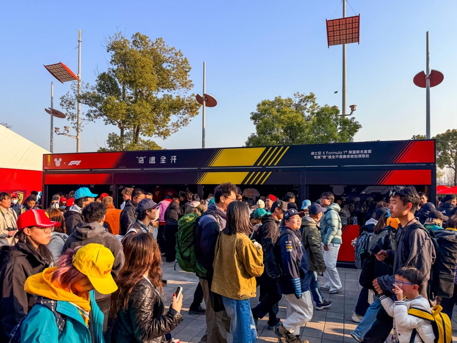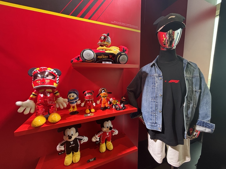 身穿全新赛车主题服装的米奇和米妮首次现身赛场,与现场车迷近距离互动、合影,为硬核赛道注入童趣活力。同时,F1商贸区内零售快闪空间已开放,以上海为灵感的Disney×F1赛事限定系列产品整齐陈列,吸引众多车迷驻足选购,实现赛事IP与城市特色的深度绑定。